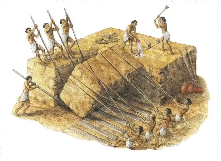 The workers had first to prepare a firm foundation by removing the loose sand from the rock. Then, the rock base had to be made absolutely flat. The workers may have done this by building low mud walls all around the base and cutting channels in a grid pattern over the surface. Then, they would fill the channels with water and mark the level the water would reach. After the water had drained away, protruding rock would have been cut back to the level indicated, and any depressions filled with stones to make a perfectly level surface.